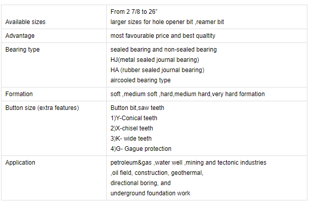 Bits sizes range from 3 7/8” to 26”.and cover almost all IADC codes.It can be used in various of different fields,mining,hydrology,subterranean heatpilling,water well drilling and oil well drilling.This type of bits have optimal bearing design, it can be working stably in high WOB,and the qualtiy tungsten carbide inserts on cone and the gauge make a good wear resistance largely extend the working life of bits.It is suitable for medium to hard formation.